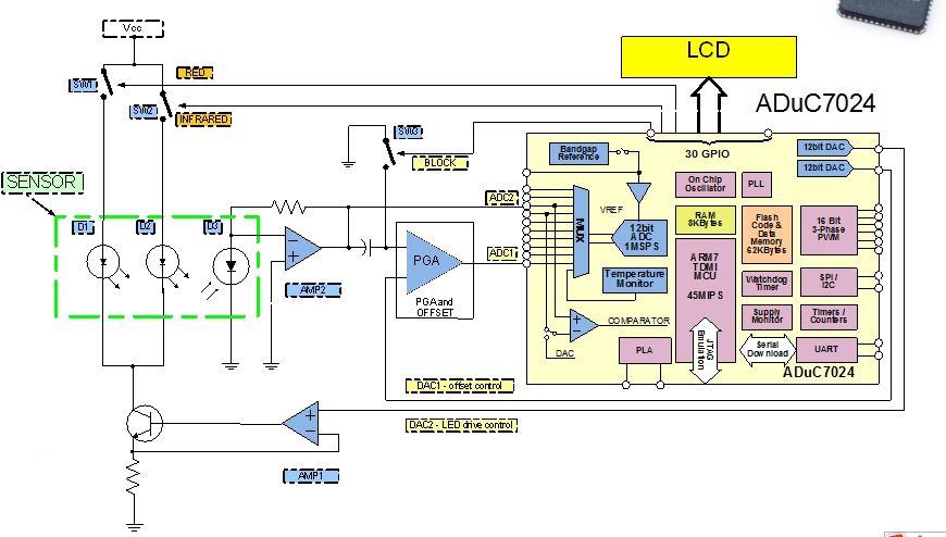 图1:基于ADI的ADuC7024的血氧仪电路框图。