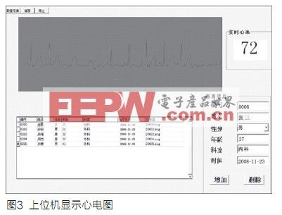 采用扫描式心电描记法,其主要原理是:从左到右画点,依次显示出相应的位置,同时新的点又将原来的点覆盖掉,中间有一段缓冲区刷掉旧点。画到最右端时,又从最左端画下一幅图,并且一直重复下去。上位机显示波形图如图3。