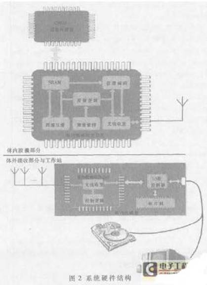 如图2 所示, 整个系统的硬件结构由三部分组成:(1)体内胶囊部分:包括具有无线收发的数字式内窥镜胶囊摄像装置内的所有电路;(2)体外便携式部分:包括便携式无线接收与数据传输装置内的所有电路;(3)体外工作站部分即计算机控制与处理装置:包括计算机与体外无线收发器和数据存储电路板。下面分别针对这三部分的电路结构进行分析。