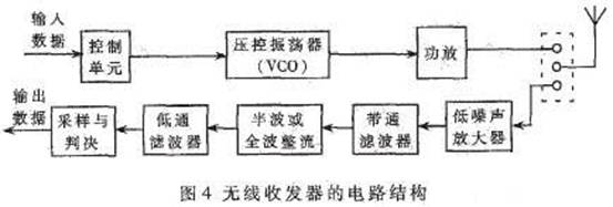 本方案中提出了一种无频率综合器的无线收发器的电路结构,如图4 所示。这在电路设计的高层次阶段保证了整个电路的低功耗。