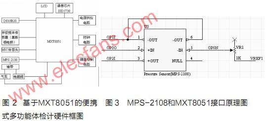 对于血压信号的感知,可采用Metrodyne Microsystem公司的MPS-2108传感器。它在血压计、数字压力计及医疗设备领域的广泛应用已表明其可以胜任本文所要设计的功能。MPS-2108传感器和MXT8051的接口原理图如图3所示。