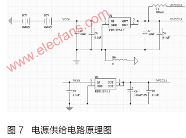 系统控制模块中,所包含的电源供给电路、时钟电路、复位电路、键盘控制电路等需要的器件都可参考由北京时代民芯科技有限公司提供的MXT8051开发板上的成熟产品,借鉴其接口方式并稍作修改,可满足预期要求。其中稍作修改的电源供给原理图及时钟电路原理图如图7、图8所示。