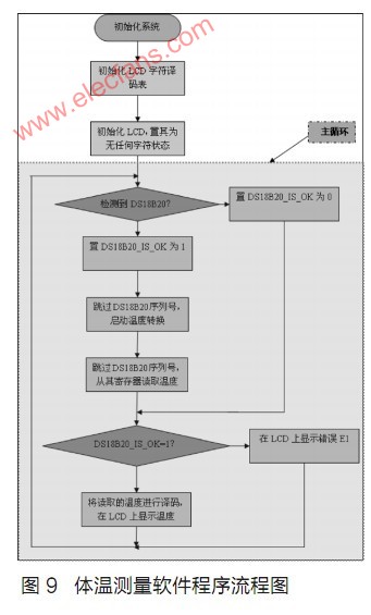 将本文提到的设计方案投入实践中,最终完整实现的功能是体温测量,在此给出体温测量的软件程序流程图如图9所示。
