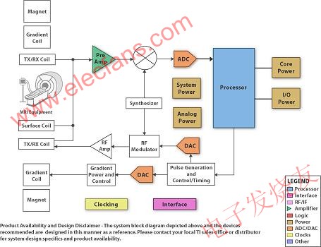 全身MRI系统可能有一个多达76个元件或通道的线圈矩阵。另外,低压(LV)模拟输入沿长同轴线缆从肢体线圈传输至模拟信号链前置放大器。当谈到MRI接收信号链时,两个关键随之出现:如何获得高信噪比(SNR)(至少约84dB或14位);如何实现总系统的极高总动态范围(至少150dB/Hz左右)。获得高SNR要求一个超低噪声系数的高性能前置放大器。使用如动态增益调节或模拟输入压缩等创新方案可以达到高动态范围要求。
