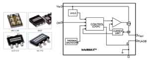 为了更好地将功率模块的能量分配到下游传感器、处理器和LCD,使用负载点功率开关正在业界变得流行。使用简单的P沟道FET来传输功率本身并不新奇。FET周围环绕着众多二极管和晶体管以增加功能,比如负载放电、浪涌电流限制和反向电流阻隔(reverse current blocking, RCB),这是其中的一部分功能。显而易见,发展趋势是转向真正的智能FET,其可在单个IC中集成这些功能。飞兆半导体提供的IntellimaxTM系列产品是可供设计人员可以选择的智能FET系列之一,其突出特性是集成了所有下述功能,过压保护(OVP)、过流保护(OCP)、RCB、压摆率控制(slew rate control),以及用于通知处理器出现故障的错误标记。图3 所示为一个典型的IntelliMAX 器件的内部示意图及所采用的封装。