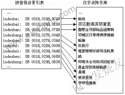 ADDR0、下一拼音组合映射的字库地址ADDR1和当前显示汉字的首地址ADDR等。根据拼音组合用遍历算法查得该拼音组合的第一个汉字的点阵地址,用向上、向下键实现翻页,通过ADDR与ADDR0或ADDR1的比较,来保证在同一拼音组合内查找汉字。