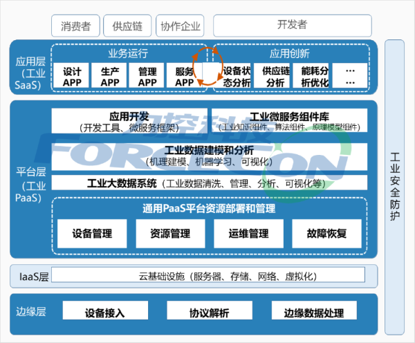整个工业互联网平台呈现出清晰的层级架构,涵盖边缘层、IaaS层、平台层(即工业PaaS层)、应用层(即工业SaaS层),以及贯穿上述各层级的安全防护。其中,边缘层、平台层、应用层是工业互联网平台的三大核心层级。