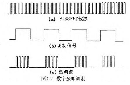 R4、C2和两个非门构成了一个多谐振荡器,R1为隔离电阻,它产生的方波频率为38KHz。如图1.2(a)所示。他从与门9脚输入,R12、其C3和其它两个非门也构成了一个多谐振荡器,R11为隔离电阻。它产生一个低频方波信号。如图1.2(b)所示.它从与门10脚输入,利用与门的开关特性,低频方波信号对38KHz高频方波信号进行数字振幅调制.即振幅键控,从3脚输出已调波信号.如图1.2(c)所示。以调波经限流电阻R。注入三极管Q1的基极,被放大后驱动红外发光二级管发出红外线,即将电信号转化成光信号发射出去。R2为集电极负载,改变其阻值可改变红外发光二极管的发光功率,从而能改变小车避障的灵敏度。