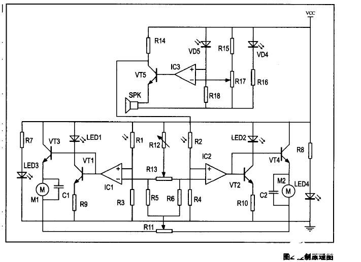 ①如图2中电位器R12、R13、R17与R5、R6、R15组成分压电路为电压比较器提供基准电压,光敏电阻R1、R2、红外接收器VD5与电R3、R4、R18组成比较电压,发光二极管LED1、LED2与三极管T1、T2及电阻R9、R10组成转向灯。发光二极管LED3、LED4与R7、R8组成光敏电阻的补光灯,红外发射二极管VD6及电阻R16组成红外发射源。R14、三极管VT5及蜂鸣器组成报警装置。三极管VT3、VT4与电动机及电容组成动力部分。
