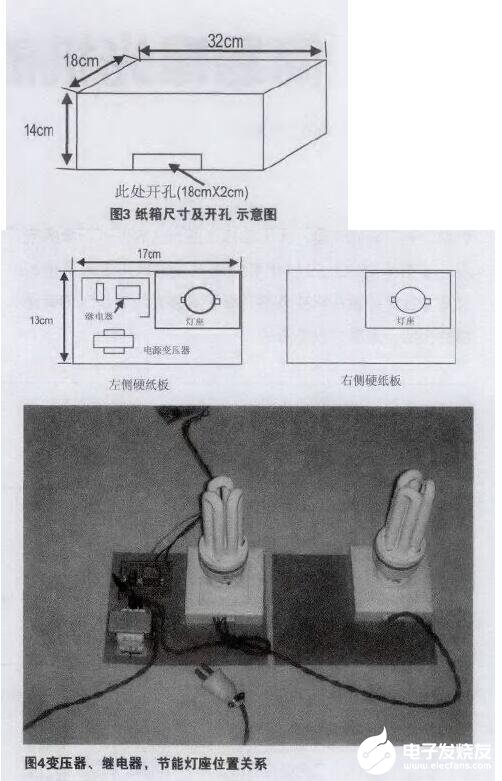 准备两块比纸箱側面稍小硬纸板,把节能灯座,9V电源变压器固定在上面,把继电器和接线柱焊接在万能板上,再固定在纸箱上面。几何位置关系如图4所示。