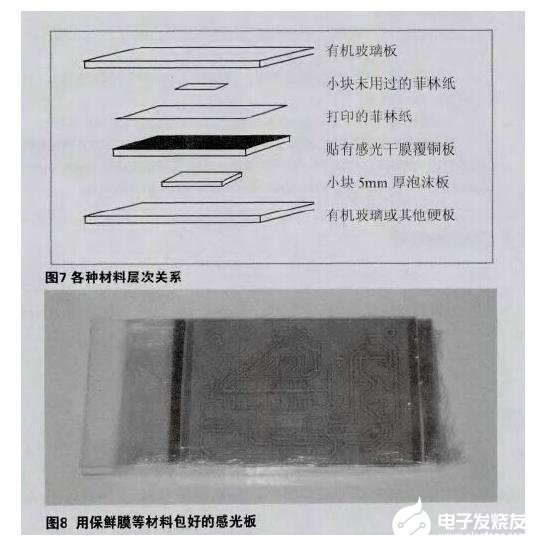 1、由于普通电子爱好者使用的覆铜板总有一些扭曲,菲林纸不能完全紧贴在粘有感光千膜的覆铜板上,严重影响曝光效果。笔者经过多次尝试,发现用下面方法很有效,即在铜板下面垫一小块5mm厚的泡沫板,在打印的菲林纸上面再放一张没有用过的小块菲林纸,之后用两块有机玻璃板夹住,并用保鲜膜包紧。如图7、图8所示。