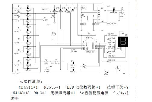 音频振荡电路为NE555组成的多谐振荡器推动扬声器发出讯响声。四只二极管(IN4148)组成二极管或门电路分别接CD4511的1、2、6、7引脚,为NE555提供电源+Ucc,即任何抢答键按下时,扬声器都能发出报警声。