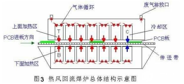 2、热风回流焊:高温加热的空气在炉膛内循环。