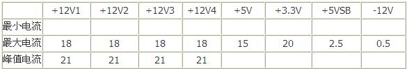第七条 当采用多路+12V时,每路最大电流统一为18A,峰值电流21A,同时限制+12V联合输出。同等功率电源的单路+12V输出与多路+12V联合输出相等。比如,300W电源当设计为双路+12V时,+12V1/18A,+12V2/18A,+12V1&+12V2联合输出不超过22A;当该电源设计为单路+12V时,+12V/22A。