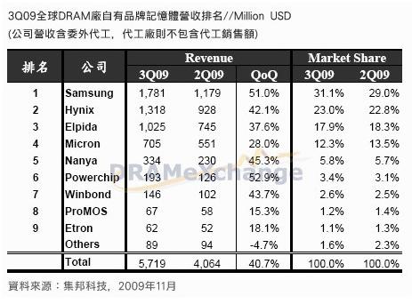 根 据集邦科技统计,2009年第三季全球DRAM产业营收为57亿1,900万美元,与今年第二季相比,上涨了40.7%。其中韩系厂商三星在DRAM合约 价上涨、制程持续转进50nm使季位成长约10%以及提高DDR3的生产比例下,其第三季DRAM营收涨幅高达51%,为17亿8,100万美元,市占 率上升2.1%~31.1%,稳占DRAM产业龙头宝座。