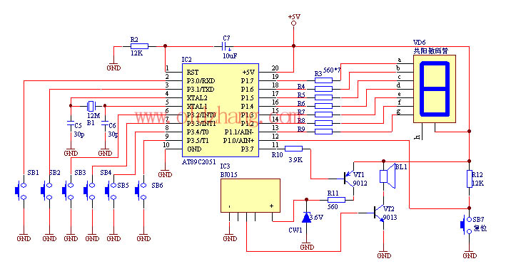 从设计所要完成的任务与要求来看,需要显示6路输入,用一只数码管便可以完成,对于7段数码管,占用7个单片机的I/O口,考虑6路输入,占用6个I/O端口,一个端口用于控制音乐电路的工作,这样,只需14个I/O便可以完成电路硬件的安排。为此,我们可以选用51系列单片机中的简易型产品AT89C2051来作为中央处理器。这款单片机的I/O作为输出时,具有较大的吸收电流能力,因此我们可以选用共阳型数码管,这样由单片机的I/O就可以直接驱动,能简化硬件电路的设计。