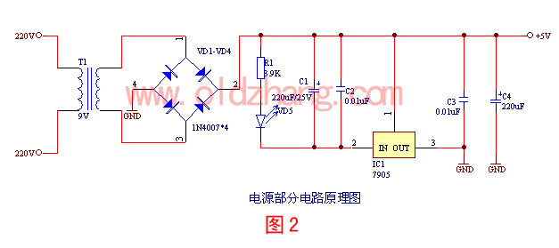 按图2的原理图,将电源部分的各元件焊上,注意极性不要搞错,对于1N4007二极管,电流从没有白线处流向有白线处,对于电解电容,有一条白线且标有"-"的为负极,元件在没有剪脚前,长的为正,短的为负。发光二极管也是长的为正,短的为负。