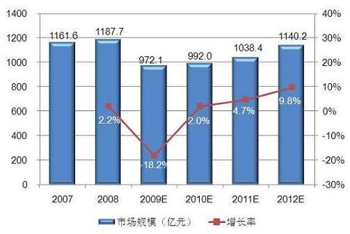 据Frost & Sullivan的研究,2008年中国市场上印刷电路板产品总销售额达到1187.7亿,其中单面板占2.5%,双面板占6.9%,多层板占73.8%,挠性板占16.8%。2008年第四季度爆发的全球金融危机对中国印刷电路板行业产生剧烈冲击,但得益于前三个季度的高增长,全行业销售额仍有2.2%的上涨,但利税总额已经出现下跌。为了应对国际金融危机的严重负面影响,中国政府制定了电子信息产业振兴规划,在一定程度上地遏制了产业的下滑。Frost & Sullivan预计2009年中国印刷电路板产品市场需求将达972.1亿元,同比下降18.2%;从2010年开始,随着各种政策效应的显现和消费者信心的恢复,市场将重新实现增长。