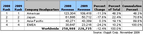 另一方面,欧洲是在2009年受挫最严重的地区。面向欧洲的半导体出货量预计下滑20.8%,总部在欧洲地区的公司的合计营业收入预计减少24.2%。