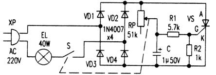 电路中,由电源插头XP、灯泡EL、电源开关S、整流管VD1~VD4、单相晶闸管VS与电源构成主电路;由电位器RP、电容C、电阻R1与R2构成触发电路。将XP插入市电插座,闭合S,接通220V交流电源,VD1~VD4全桥整流得到脉动直流电压加至RP,调节RP的阻值,就能改变C的充/放电时间常数,即改变VS控制触发角,从而改变VS的导通程度,使EL获得0~220V电压。RP的阻值调得越大,则EL越暗,反之越亮,达到无级调光的目的。