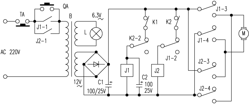 电源变压器B、桥式整流堆和电容C1组成12V直流电源。继电器J1、J2和行程开关K1、K2组成互锁电源极性切换电路。