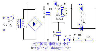 该暗室交直流两用灯具有无触点自动转换开关功能。采用橙色发光二极管。
