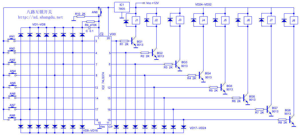 电路工作原理 电路供电电源为12V ,再由IC1(7805)稳压输出5V电源供给IC2(74LS374)作为工作电压。IC2和外围相关元件组成八路互锁开关电路,现由继电器J1~J8组成开关执行器件。IC2的各引脚功能已在图中标注。①脚EN为使能端,低电平有效,所以这里把①脚直接接地。D1~D8为触发端,CP为时钟端,Q1~Q8为输出端等。当依次按动按钮开关AN1~AN8时,对应的各触发端D1~D8和CP端分别处于高电平,此时输出端Q1~Q8也依次输出高电平,该高电平通过对应的晶体管使继电器依次工作。不仅如此,各开关的工作还可任意选择。该电路要完成上述正确的逻辑功能,还需设两种辅助电路: