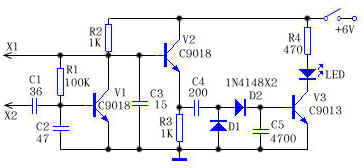 图中,V1及其外围元件(包括被测晶振)共同组成一个电容三点式振荡器。当探头X1、X2两端接入被测晶振时,电路振荡。振荡信号经V2射极跟随级放大后输出,经C4耦合、D1、D2倍压整流后为V3提供偏置电流,V3导通,LED发光。若晶振不良或断路,电路则不能起振,因而LED不发光。