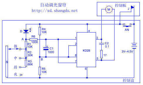 当室外光照增强时,室内光照也增强,光敏二极管内阻变小,A点电位上升,KD28输出端3脚电位升高,5脚电位下降,电机M正转,窗帘缓缓关闭,直至室内光照减弱、D的电阻上升到使电桥重新平衡为止。反之,当光照减弱时,电机M反转,窗帘缓缓打开。C1、R6起延时作用,它能使控制过程缓缓进行,可避免因风偶然吹开窗帘而造成电机的反复起动。