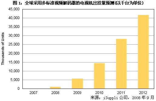 图1所示为iSuppli公司对于全球多标准DTV视频解码器市场的预测。