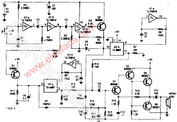 当门铃开关被按下时。两级单稳态电路和继被激活,把偏压加到以对压控电阻级,然后去调制以对音频发生器的输出信号,经过调制的信号被送到放大器,经放大再送到扬声器。