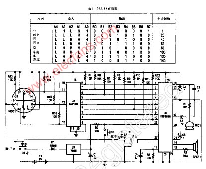 报话式罗盘主要一个霍尔效应方位传感器MOB1和一个模拟音频存储器SD1016组成,它能为罗盘的8个主要方位编制8个(各编制一个)2秒钟的报话声,该报话式罗盘由以个数字式罗盘(MOO1)模拟音频存储器SD1016(U2),一个74S188预编程PROM(U3)和少量附件所组成。