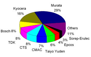 LTCC技术最早由美国开始发展,初期应用于军用产品,后来欧洲厂商将其引入车用市场,而后再由日本厂商将其应用于资讯产品中。目前,LTCC材料在日本、美国等发达国家已进入产业化、系列化和可进行材料设计的阶段。在全球LTCC市场占有率九大厂商之中,日商有Murata,Kyocera,TDK和Taiyo Yuden;美商有CTS,欧洲商有Bosch, CMAC,Epcos及Sorep-Erulec等。国外厂商由于投入已久,在产品质量,专利技术、材料掌控及规格主导权等均占有领先优势。图1给出全球LTCC厂商市场占有情况。而国内LTCC产品的开发比国外发达国家至少落后五年,拥有自主知识产权的材料体系和器件几乎是空白。国内目前LTCC陶瓷材料基本有两个来源:一是购买国外陶瓷生带;二是LTCC生产厂从陶瓷材料到生带自己开发。随着未来LTCC制品市场中运用LTCC制作的组件数目逐渐被LTCC模块与基板所取代,终端产品产能过剩,价格和成本竞争日趋激烈,元器件的国产化必将提上议事日程,这为国内LTCC产品的发展提供了良好的市场契机。中国在LTCC市场占据一定份额的是叠层式电感器和电容器生磁带。目前,清华大学材料系、上海硅酸盐研究所等单位正在实验室开发LTCC用陶瓷粉料,但还尚未到批量生产的程度。南玻电子公司正在用进口粉料,开发出介电常数为9.1、18.0和37.4的三种生带,厚度从10µm到100µm,生带厚度系列化,为不同设计、不同工作频率的LTCC产品的开发奠定了基础。国内现在急需开发出系列化的、拥有自主知识产权的LTCC 瓷粉料,并专业化生产LTCC用陶瓷生带系列,为LTCC产业的开发奠定基础。