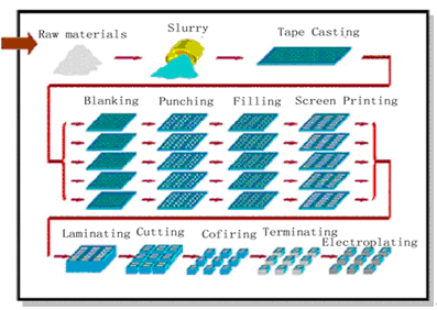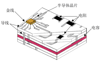 LTCC工艺流程见图2。图3为典型的LTCC基板示意图,由此可知,采用LTCC工艺制作的基板具有可实现IC芯片封装、内埋置无源元件及高密度电路组装的功能。