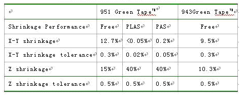 Dupont公司研发的控制收缩烧结技术已应用于60%LTCC基板和30%的LTCC电路产品中。图5为Dupont公司的控制收缩技术,表4给出相应的性能。
