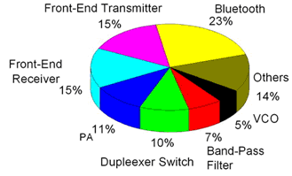 LTCC器件按其所包含的元件数量和在电路中的作用,大体可分为LTCC元件、LTCC功能器件、LTCC封装基板和LTCC模块基板。LTCC属于高新科技的前沿产品,广泛应用于微电子工业的各个领域,具有十分广阔的应用市场和发展前景。目前LTCC 技术已经进入更新的应用阶段,包括无线区域网络、地面数位广播、全球定位系统接收器组件、数位信号处理器和记忆体等及其他电源供应组件甚至是数位电路组件基板。例如,村田、三菱电工、京瓷、TDK、Epcos、日立、Avx等十多家开发的手机无线开关组件,NEC、村田和和易利信等开发的蓝牙组件都是由LTCC技术制成的。此外,LTCC组件因其结构紧凑,高耐热和耐冲击性,目前在军工和航天设备中广泛应用,预计未來在汽车电子系统上的应用也会非常普遍。CTS 公司已经宣布将为汽车电子市场提供低温烧结陶瓷(LTCC)电路板。图6为目前LTCC器件应用领域所占比例。
