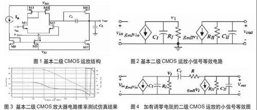 本文介绍的典型基本二级运算放大器具有结构简单、在密勒电容的调节下工作稳定、有较大的开环增益等特点,但是其单位增益带宽较小,所以通过对基本二级CMOS运放结构增加调零电阻,在不改变其他参数的情况下通过抵消二级极点扩展单位增益带宽。调零电阻偏差分析对实现运算放大器频率特性具有十分重要的意义,通过讨论,本文提出了对调零电阻偏差影响的分析方法。