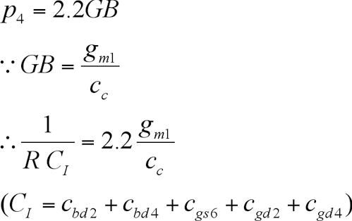 联立两个公式(7)和(8)得Cc和R。在设计时三级极点()远大于四级极点,最后使得单位增益带宽主要由p4来决定。