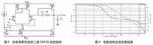 假设相位裕度为60o,通过对图1的仿真结果数据和公式(6)、(7)得Cc=1.65pF ,R=6788.5Ω。对图5的电路进行仿真,仿真结果如图6,从图中可得电路的单位增益带宽扩展为13.4MHz,而且相位裕量为60.5o。图5电路结构零极点如表2所示。从表中可以看出电路的二级极点等于一级零点,可以相互抵消。