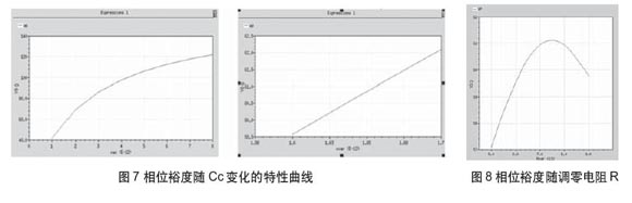 在Cadence环境下,仍然采用BSIM3V3模型AA1833C05工艺下对图5中调零电阻R和密勒电容Cc的偏差引起的相频特性曲线变化进行仿真测试,仿真结果如图7和图8所示。根据公式(11)得出,相位裕度随着CC的增大非线性增大(如图7左图),当CC变化较小时,相位裕度近似的是CC的一次正比函数(如图7右图),根据图7 得出当CC增加5%,相位裕度增加了3.4%。图8是相位裕度随调零电阻变化的特性曲线,图中可以看出,调零电阻在小于7.5Ω时,相位裕度非线性增加,当大于7.5kΩ时,相位裕度非线性减小。根据公式(10)也可以看出,当R=1/2gm6=7.5kΩ时,电路有最大的相位裕度。