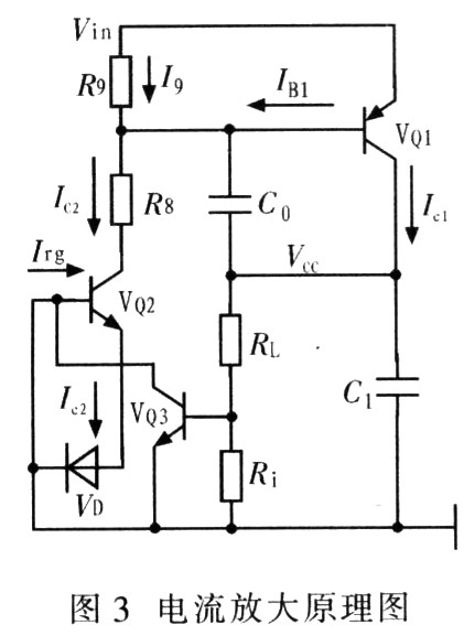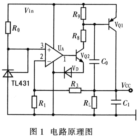 电流放大采用两个三极管,UA通过驱动调整管VQ2控制调整管VQ1,组成反馈实现电流放大环节,对输出电压进行调节,从而实现稳压输出。二极管VD在运放UA低压输出时使调整管VQ2基极一发射极电压为负,使VQ2立即进入截止状态,电流Ic2迅速降低,VQ2的VCE升高导致VQ1的基极电压升高,使 VQ1的基极电流IB减少,进而减少输出电流ICQ1(βIB);反之同理。RL是输出负载,C0和C1是滤波电容。