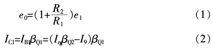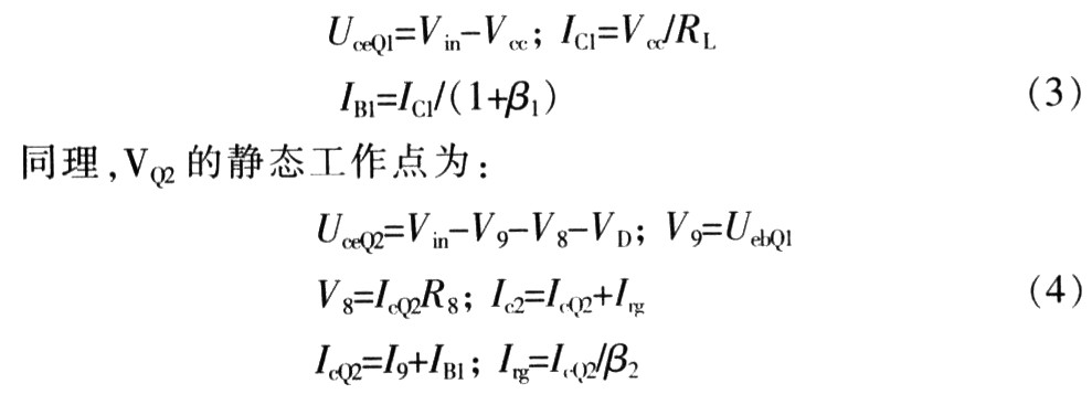 调整管VQ1和VQ2主要参数:(1)反向电压VCEO不小于Vin的2 倍的裕量;(2)最大允许电流ICM,不小于输出电流I0的2倍的裕量;(3)耗散功率PCM应在功率损耗的安全区内;通常为了安全可靠,参数应按照实际值的几倍选取。设置适当的静态工作点(即确定基极静态电流Ih,发射极电流Ie,集电极一发射极静态电压Uce),可以在保证输出稳定精度的同时使调整管的损耗最小。合适的静态工作点首先要求调整管工作在放大状态,其次要满足电网和负载波动情况下,Ib、Ie、Ucc尽量小,以减少损耗。设置静态工作点要选择合适的驱动管VQ1和偏置电阻R8、R9。VQ1的静态工作点为:
