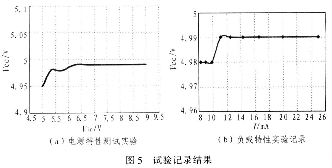 图4为设计的一个直流稳压电源模块,输入电源为直流5~9 V的蓄电池组;分别对设计电路进行电源特性和负载特性试验,其中负载特性试验以输入的6.5 V蓄电池模拟实际使用工作环境。图5为其试验记录结果。输出纹波试验数据,当电源输入电压为5-11 V,输出纹波为5~8 mV。