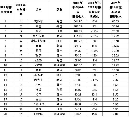 IC Insights在其报告中指出,在2009年第一季度,全球前20大半导体厂商仅有3家的座次没有动摇,其它厂商都因为信贷紧缩和库存问题而风雨飘摇。该公司预测,在下个季度,许多半导体供应商的销售额将出现两位数的强劲增长,但业绩不稳定的状态还将延续。