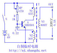 V选用3DD59A,R用1/4W的普通电阻,C选用0.22μF/50V,变压器需自制,N1、N2绕组用?0.9mm的漆包线,N3绕组用?0.67mm的漆包线,绕组框架可用1mm厚的硬纸板制作,磁芯最好用铁氧体U型或环型,如没有,就用普通E型或F型硅钢片代替,直流电流G用6V蓄电池。
