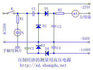 电路如下图。D1、D2、C1、C3构成一倍压整流电路;D3、D4、C2、C4构成另一极性相反的半波倍压整流电路。两电路组合后,可输出-275V、-550V、-1100V高压。由于没有采用隔离变压器,为安全起见,设置了一个用手触摩的火线指示器,使与开关联接的一端永为火线。使用时,先接通电源,用手触铜片,若氖灯亮,即可使用。R2是保护表头用的限流电阻,表头满度电流为0.1mA,也可用万用表电流档代替。