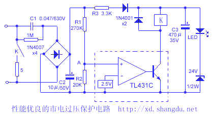 本人制作的过压保护器,由于采用精密稳压集成电路TL431C,电压定值准确,工作可靠;采用电容器储存电能推动继电器,因此静态功耗低,仅0.1W;采用短路电源保护,使家中用电器都能得到有效保护,具有使用方便等优点。