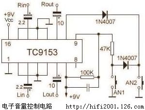 TC9153是东芝公司推出的CMOS高保真音量控制专用集成电路。该电路的特点是功耗低,电流约为1~3mA。失真小,THD≤0.005%。音量衰减范围为0~-60dB,每2dB为一步。以按键控制音量,一改传统电位器使用寿命不长、噪声大等缺点。