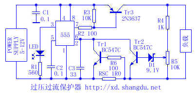 若负载出现过压,则经R4、R5、D1后Tr2导通,也使555触发,Tr3这时也将负载隔离。