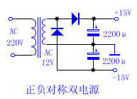 在进口电子设备中,可经常看到用图示这种正负电源,对运放集成块供电的电路。其特点是:1.制作或选择电源变压器非常方便,变压器次级绕组无需带中心抽头。2.正负电源电压对称。3.电能的利用率较高。4.结构简单。实践证明:在电源变压器功率容量足够的前提下,适当加大电容容量和变压器次级绕组线径,该电路也可用于小功率的音频功放作正负对称双电源供电。